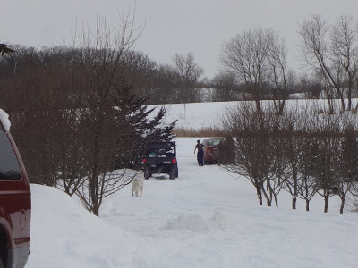 Last week they were out there working for the whole afternoon, so I decided to throw on my boots and hike the quarter mile path through the snow and out to their site. I packed some snacks and headed out. As soon as I walked out of the house with my gear on, and Jackson saw me, he did this little leap in the air as if to say, "Yippee, where we headed this time?".   He loves going on walk through the slough with me.